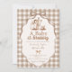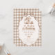 This charming baby is brewing baby shower invitation features a classic coffee pot centerpiece nestled in a warm brown gingham pattern — a uniquely cozy choice for a coffee-themed, café, or gender-neutral baby shower. Earthy tones and a rustic plaid background make this invitation the perfect fit for a "a baby is brewing" celebration with a warm, homey aesthetic.