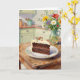 A birthday card for her with a sweet illustration of a piece of chocolate cake, pretty colorful flowers sitting on a rustic wood table in a cute cottage kitchen.