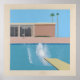 This iconic mid‑century scene captures the precise moment after a diver’s plunge—a soaring burst of white foam against the serene blue pool of a modern California home. Painted in 1967, its crisp geometry, flat color fields, and absence of human figures evoke sunny leisure and elegant composure. Perfect for elevating living rooms, offices, gallery walls, or hospitality spaces with timeless style and subtle narrative energy.