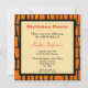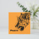 Födelsedagsfest inbjudan. En realistisk svart och gult leopard teckning. Coolan tittar svarta fläckar med munnen öppen och avlossad och visar av sina tjusiga tänder. Underbar för en vild party. På baksidan finns ett funky-stammar mönster i orange och svart. Ange dina uppgifter om party i beige-rutan med ett svart gräns.