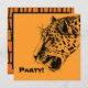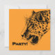 Födelsedagsfest inbjudan. En realistisk svart och gult leopard teckning. Coolan tittar svarta fläckar med munnen öppen och avlossad och visar av sina tjusiga tänder. Underbar för en vild party. På baksidan finns ett funky-stammar mönster i orange och svart. Ange dina uppgifter om party i beige-rutan med ett svart gräns.