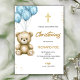 A christening invitation with a soft, pastel design features a teddy bear holding blue balloons, a gold cross, and elegant gold text on a white background.