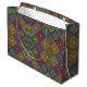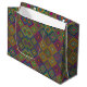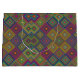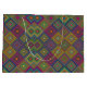 A colorful gift bag with a vibrant geometric pattern of overlapping squares in various bright colors. Features white handles. Bold and festive design.
