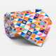 A colorful necktie with a vibrant geometric pattern featuring diamonds and circles in orange, blue, pink, and white on a plain white background.