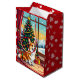 An adorable Christmas gift bag with a festive Corgi sitting in front of the fireplace on a cold winter day. A Christmas tree decorated and a festive background.