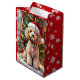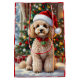 An adorable Christmas gift bag with a festive poodle sitting in front of the fireplace on a cold winter day. A Christmas tree decorated and a festive background.