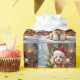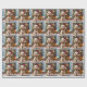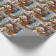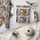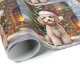 An adorable Christmas gift wrap with a festive poodle sitting in front of the fireplace on a cold winter day. A Christmas tree decorated and a festive background.