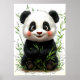 A cute panda with rosy cheeks sits happily surrounded by bamboo shoots. Its big, expressive eyes and playful demeanor create an endearing and cheerful vibe.