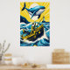 En vismisk illustration som skildrar en fiskare i en liten båt som roterar genom vågar, med en valstrande överkropp och en fyr i avstånd. Scenen är fylld med levande färg och lekfulla detaljer som skapar en känsla av och äventyr.