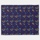 A fleece blanket featuring a colorful repeating pattern of guitars and musical notes on a dark background. The back is plain white.