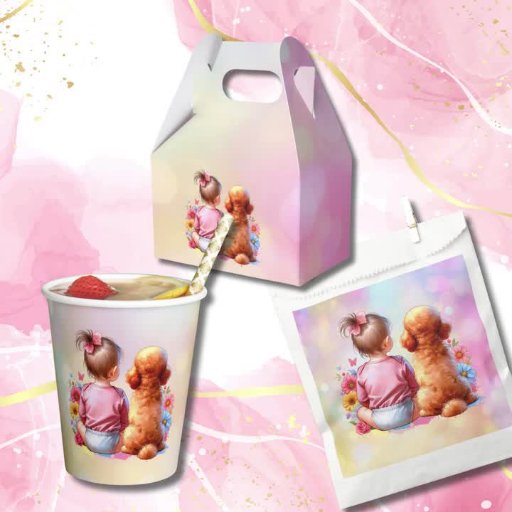 Flickans inbjudningar till babyduschen. Söta flicka sitta intill en Apricot Pudel i ett plåster med söt vattenfärgblommor. De hålrum som används är rosa, koral, lila, blått och gult.