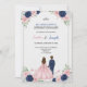A floral-themed invitation with a couple facing away, the woman in a pink dress and the man in a blue suit. Text details an event for Sophia and Joseph
