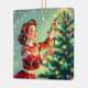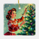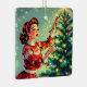A cute Christmas ornament with vintage vibes. A retro lady hanging Christmas lights on a Christmas tree. The back has a humorous quote about Christmas lights.