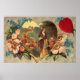 Vintage Alla hjärtans dag poster med en vacker viktoriansk kvinna i en blomsterträdgård i land och omgiven av ett hjärta.