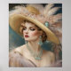 En judisk elegans I porträtt är ett häpnadsväckande hyllning till Art Deco-eran, med en kvinna av andlig skönhet. Hennes skulpterade egenskaper accentueras av hennes mjuka, rökiga nyanser i smink och rikens rött i hennes perfekt konfunderade läppar. Hon bär en opulent hatt med pastellfjädrar som kaskade som en mjuk vattenfall och tillfogar ett litet förfinat drama till sin poise. Hatten, tillsammans med den lavish aqua-smycken som sliter hennes halsduk och öron, utstrålar lyxen och stil som definierade de tjugonigheter som var nära. Hennes gärning är ett uttryck för tyst förtroende och allure, kännetecknande för den tidlösa nonchalanta elegansen.