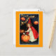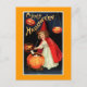 Klassiskt vintage Halloween-kort som visar en liten flicka klädd i en röd hatt och kloak omgiven av fyra pumpor och som önskar oss " A Jolly Halloween".