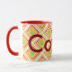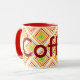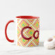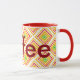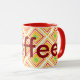 Stora designer-kaffe mugg, gult, grönt, burgundi och rött. Text kan vara personlig med namn, eller text kan också tas bort, till kostym i ditt kök stil.