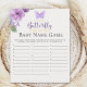 Carta de juego con el nombre del bebé, con una Hermosa Tematica de Mariposas y flores en acuarela en tonos Rosas y Purpuras. con linda tipografia dorada con la frase " A LITTLE BUTTERFLY IS ON THE WAY" un fondo amarillo claro es ideal para recibir a esa dulce niña que viene en camino, Juego perfecto para jugar durante el baby shower. Se pide a los invitados que escriban los nombres de los bebés que comienzan con cada alfabeto. ¡Quien termine todos los alfabetos primero gana!