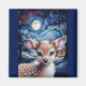 En viskös fawn står i förgrunden, omgiven av en magisk vinternatt med en måne-glödande ljusa glöd i fullt i himmel. I bakgrunden, en mysigt kabinkapsel mellan snö-täckt träd.