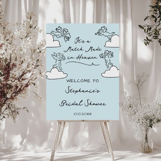 Guide guests in sweet, heavenly style with this A Match Made In Heaven Cards & Gifts Bridal Shower Tabletop Sign Poster. Designed with a soft sky-blue background and a charming hand-drawn cupid illustration, this sign adds a romantic and welcoming touch to your gift table.