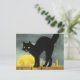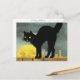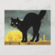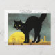 Vintage Halloween-illustration som visar en svart katt på ett stängsel med måne-ansikte bakom.