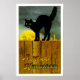 Vintage Halloween-illustration som visar en svart katt på ett stängsel med måne-ansikte bakom.