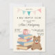 Every kid loves to read, no matter their gender! Stock a baby’s library at a bring-a-baby-book baby shower. Add instructions for bringing a book to the party with these “A new chapter begins`` shower invitations! You can also use these invitations to invite guests to a baby shower hosted at a bookstore or library or your home! Perfect for parents-to-be who are teachers, librarians or bookworms, who just love to read! The modern design with a vintage twist features a stack of books with a cup of tea on top and a teddy bear on the side, all in pastel natural colors. Perfect for a gender neutral shower, baby boy or baby girl! The text in handwritten typography and script is totally editable by clicking on the ´´Personalize´´ button.