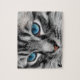 Vackert nära en Silver Tabby katt ansikte med vackra blå ögon. Detta 8x10-pussel finns i en presentburk, även i en större storlek utan tenn. Denna utformning skapades av Doreen Erhardt© från ett fotografi av Pixabay. 100 procent av intäkterna från försäljningen av Jigszle Puzzle doneras till A-PAL Humane Society.