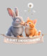 Realistic grey rabbit and kitten share a serene moment on teal. "A QUIET UNDERSTANDING" - elegant art for pet lovers.
