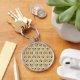 A round keychain with a floral pattern featuring yellow, purple, and white flowers. It sits on a table with a smartphone, notebook, and orange flowers.