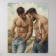 The two subjects embody rugged, raw masculine beauty. Their aesthetic is one of scruffy elegance and powerful physicality, featuring strong, meticulously groomed beards, expressive, dark hair, and powerful, perfectly sculpted torsos. They are casually dressed in heavily distressed denim, highlighting their relaxed, country environment, with one figure adding an authentic, rustic touch with classic leather suspenders. The depiction of body hair and commanding musculature is unapologetically naturalistic and powerful.