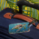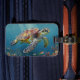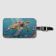 A sea turtle themed luggage tag with an illustration of a sea turtle under a calm teal sea swimming among the coral on the ocean floor with sun rays beaming down on him through the aqua water.