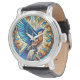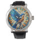 Ett häpnadsväckande glasfönster av nedfläckad med ett vackert intrikat blåfågelskåp i vibrerande färg.