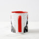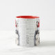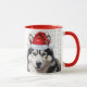 Mugg har en design av ett sött Siberian husky som bär en julhatt. Bakgrunden till mugg är täckt av en upprepande mönster av ord "svullnad". Bilden är ljus och glad, och det skulle vara perfekt för en jultemad gåva.
