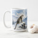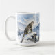 A pretty wildlife coffee mug with an illustration of a majestic snow leopard perched on a craggy, snow-covered peak, gazing out at a vast, frozen mountain range.