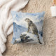 A pretty wildlife throw pillow with an illustration of a majestic snow leopard perched on a craggy, snow-covered peak, gazing out at a vast, frozen mountain range.
