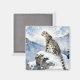 A pretty wildlife magnet with an illustration of a majestic snow leopard perched on a craggy, snow-covered peak, gazing out at a vast, frozen mountain range.