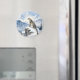 A pretty wildlife magnet with an illustration of a majestic snow leopard perched on a craggy, snow-covered peak, gazing out at a vast, frozen mountain range.