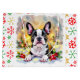 An adorable Boston Terrier dog sitting in illuminated Christmas lights seasonal festive gift bag.