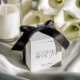 A refined black and white wedding favor box featuring graceful calligraphy paired with a timeless serif font.