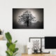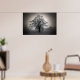 Ett svart och vitt foto från öga av ett träd omgivet av tjockt dimma.