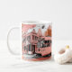 This artwork depicts a vintage pink tram traveling along a street lined with classic buildings.