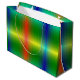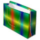 A vibrant gift bag featuring a glossy, rainbow gradient design with vertical stripes. The white handles contrast against the colorful background.