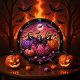 Den här vita, cirkulära illustrationen visar en mängd ornatalt utsmyckade pumpor i olika orange-, lila- och rosa. Den största pumpen är bunden av en svart och rosa stripe-buk. Soky-scenen omfattar fladdermus, spindlar på en webben och fullt under en livfull lila och rosa natten himmel.