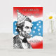 Patriotisk födelsedagsfest inbjudan med Abraham Lincoln som ler och bär en födelsedagsfest hatt med en röd, vit och blå design av ränder och stjärnor bakom honom. Fira, skratta och festa skrivet på omslaget. Anpassa din festinformation innanför som du vill innan du checkar ut. Konst, bild och vers copyright © Shoaff Ballanger Studios, 2022.