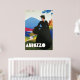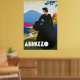 Den här vintagen poster en region i Italien som heter Abruzzo. Det här är en mer aktuell utformning som görs i blues, red guld och black. En kvinna står i förgrunden klädd i svart.