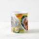 Whimsical photo mug featuring two photos of your dog or other favorites on a custom collage of abstract art. A bright and colorful mug for a dog lover.