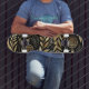 One of a kind black gold on a palette of minimal design with a touch of Boho on the skateboard. This design is quirky, funky, whimsical and pretty. You can as well hang it on your wall to bring glamour and art indoors.