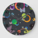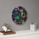 keep track of time with a piece of functional art using this wall clock featuring a bold contemporary nature pattern and multi-color butterfly print. the vibrant neon rings and floating spheres create a dynamic visual on the clock face, making it a perfect centerpiece for a kitchen, office, or bedroom. this modern pop aesthetic timepiece combines practical utility with a unique artistic flair that complements any contemporary interior design.