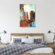 Abstract cityscape with tall, colorful skyscrapers evokes a sense of urban dynamism. The blend of blues, reds, and oranges creates a vibrant atmosphere.